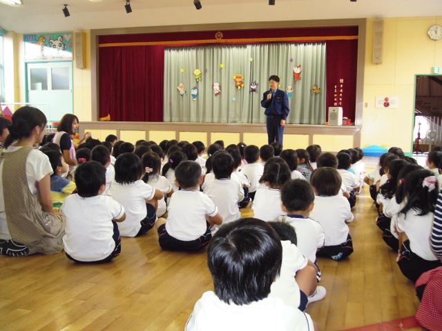 今日は幼稚園に青森警察署の ナイトポリスMEDACHI隊とチュータくんが 来てくれました。 交通安全教室の始まりです。